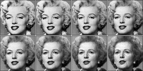 Морфинг и особенности работы мозгаИногда программы для морфинга находят весьма неожиданное применение. Ученые из Лондонского университета (University College London) провели интересное исследование, направленное на выяснение причин нарушений работы мозга у людей, имеющих проблемы с узнаванием знакомых. В данной работе использовались в том числе и программы для морфинга. Исследование показало, что человеческий мозг всегда пытается найти сходство человека с какой-либо известной личностью, даже если это виртуальный человек, созданный с помощью морфинга. На рисунке показана последовательность кадров, на которых Мерилин Монро превращается в Маргарет Тэтчер. Опросы показали, что лицо, в котором содержалось 60% черт лица Мерилин Монро и 40% черт Маргарет Тэтчер, распознавалось как Мерилин Монро в более зрелом возрасте, а лицо с 40% черт Мерилин Монро и 60% черт Маргарет Тэтчер как лицо Маргарет Тэтчер, которое выглядит «более сексапильно, чем обычно».