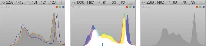 В нижней части панели настроек находится динамически обновляемая гистограмма. Цветные маркеры в верхних углах области отображения гистограммы сигнализируют о наличии клиппинга в каждом из цветовых каналов. Щелкнув по гистограмме, можно изменить ее вид. Над полем гистограммы в числовом виде отображаются текущие координаты курсора и значения уровней по каналам RGB в соответствующей точке кадра.