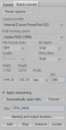 Как уже было упомянуто, строка главного меню в интерфейсе RAW Shooter Essentials 2006 не предусмотрена. Для того чтобы сконвертировать снимок с текущими настройками, необходимо добавить его в очередь обработки, нажав на соответствующую кнопку-пиктограмму в верхней части окна программы или же на кнопку Add в закладке Batch convert панели настроек. Конвертация снимков производится в фоновом режиме, благодаря чему пользователь может одновременно работать с настройками для других кадров. Кроме того, предусмотрена возможность печати изображений непосредственно из RAW Shooter Essentials 2006. Поместить выбранный кадр в очередь печати можно при помощи соответствующей кнопки-пиктограммы.