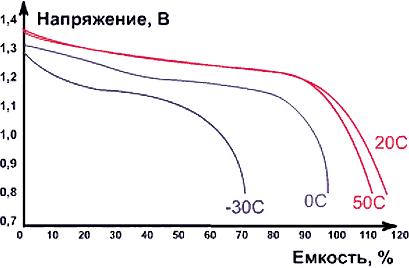 Отметим также влияние температуры окружающей среды на форму разрядных кривых и на реальную емкость аккумуляторов. Рассмотрим функциональную эффективность типичного никель-металлгидридного аккумулятора (NiMH) в зависимости от температуры. Такая батарея рассчитана, как правило, на 500-600 циклов зарядки-разрядки. При этом изменение разрядной емкости при колебании температуры окружающей среды прямо пропорционально изменению температуры (t) и может быть оценено в процентах по следующей формуле: Сн = 90 + 0,77 t (%).