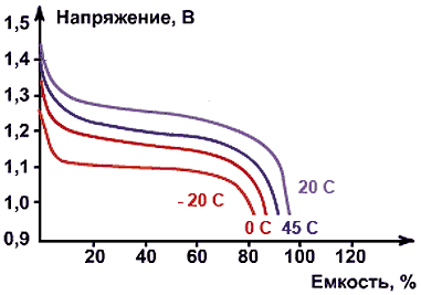 Диапазон рабочих температур у NiMH-аккумуляторов также меньше, чем у NiCd-батарей. Так, если температура –20 °C является пределом, при котором NiMH- и Li-ion-аккумуляторы прекращают функционировать, то NiCd-батареи могут продолжать работать до температуры –40°C.