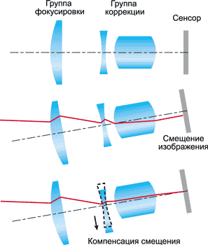 Значительно более эффективными являются системы стабилизации, позволяющие смещать изображение, проецируемое через оптическую систему фотоаппарата, и таким образом компенсировать его движение относительно светочувствительного сенсора. Эффективность подобных систем объясняется тем, что такое решение позволяет устранить причину смазывания изображения.