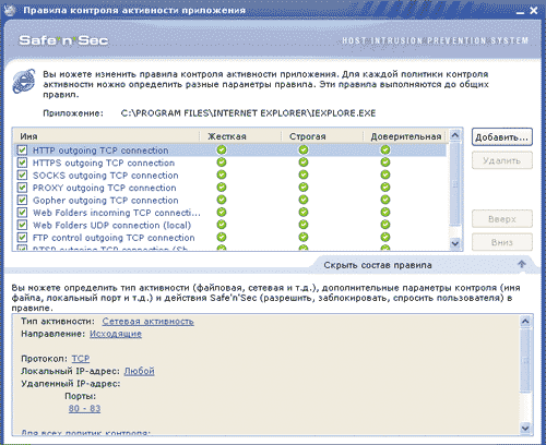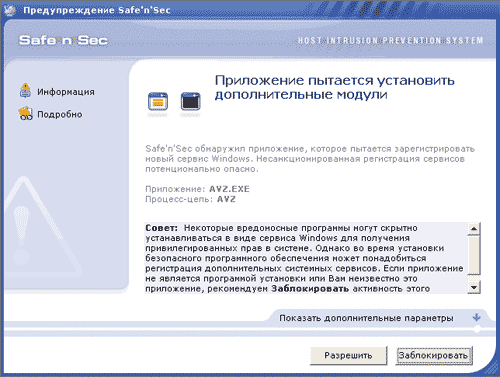 Окно с предупреждением Safe’n’Sec содержит достаточно подробное разъяснение сущности предупреждения и опасности действия, по поводу которого от пользователя требуется принятие решения (рис. 7). Решение может быть либо принято на сеанс (например, для процесса инсталлятора на время его работы), либо оформлено в виде правила. Для некоторых типовых программ (например, браузера) имеются готовые наборы правил, которые могут быть отредактированы. Правила строятся при помощи специального построителя правил.