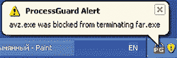 Для слежения за активностью приложений Process Guard устанавливает драйвер procguard.sys и перехватывает 20 KernelMode-функций на уровне KiST. При блокировке действий некоторого приложения Process Guard уведомляет об этом пользователя, выводя всплывающее сообщение рядом со своей иконкой в системной области (рис. 3). Это сообщение содержит минимум информации, однако оно дублируется в протоколе со всеми техническими подробностями.