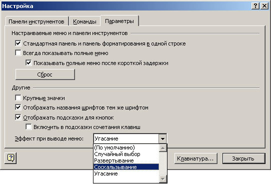 Мало кто знает об интересной возможности Word по анимационной настройке меню. Чтобы ею воспользоваться, выберите команду Сервис => Настройка => Параметры, а затем в поле со списком Эффект при выводе меню установите один из предлагаемых вариантов (рис. 1) и щелкните по кнопке Закрыть. После этого выберите любой пункт меню и оцените результат.