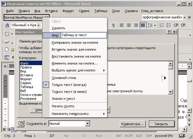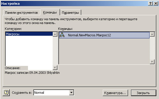 Чтобы создать макрос, установите курсор в таблицу, которую необходимо преобразовать в текст, воспользуйтесь командой Сервис => Макрос => Начать запись, щелкните по кнопке Панели откроется окно Настройка. Выделите созданный макрос в правой части данного окна (рис. 10), установите его сохранение в шаблоне Normal.dot и перетащите макрос на панель инструментов (рис. 11).