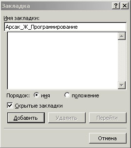 Для добавления закладки выделите элемент, которому следует назначить закладку, в меню Вставка выберите команду Закладка, в поле Имя закладки введите нужное имя. Имя закладки должно начинаться с буквы; в нем могут использоваться цифры, но не должно быть пробелов. Если требуется разделить слова в имени закладки, то воспользуйтесь знаком подчеркивания. По окончании нажмите кнопку Добавить (рис. 13).