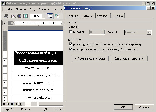 Довольно неудобно работать с многостраничными таблицами, когда головка таблицы приводится лишь на первой странице, а на всех последующих приходится только гадать, какая информация расположена в том или ином столбце. Исправить этот недостаток можно, включив отображение шапки таблицы на всех последующих страницах. Для этого выделите первую строку (которая и является головкой таблицы), а затем в контекстном меню, вызванном правой кнопкой мыши, выберите команду Свойства таблицы => Строка и установите флажок Повторять как заголовок на каждой странице (рис. 15).