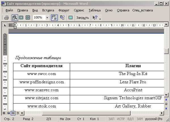 Перед второй страницей нужно сделать разрыв страницы и создать новый раздел командой Вставка => Разрыв => Новый раздел со следующей страницы. Далее добавьте перед таблицей две строки: первую — для заголовка «Продолжение таблицы» с границей только снизу, а вторую — с головкой. Затем повторите эти две строки в качестве заголовка таблицы (рис. 16) командой Свойства таблицы из контекстного меню, установив на вкладке Строка флажок Повторять как заголовок на каждой странице. Результат может напоминать рис. 17.