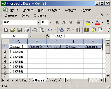 Если столбец или строка состоит из каких-либо названий с порядковыми номерами, например «1 склад», «2 склад» или «Склад 1», «Склад 2» и т.д., то совсем не обязательно вводить каждое последующее название вручную. Достаточно ввести первое название, установить мышь в правый нижний угол ячейки (маркер превратится в знак «+») и перетянуть выделение за правый нижний угол (рис. 18). Правда, данный способ не сработает, если порядковый номер находится в середине фразы.