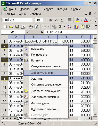 Если в таблице имеется несколько несмежных столбцов (или строк), перед каждым из которых нужно вставить пустой столбец (или строку), то это можно осуществить за один прием. Выделите соответствующие столбцы (или строки) при нажатой клавише Ctrl, нажмите правую кнопку мыши и выберите из контекстного меню команду Добавить ячейки (рис. 19) перед всеми выделенными объектами будут одновременно добавлены пустые столбцы (или строки).