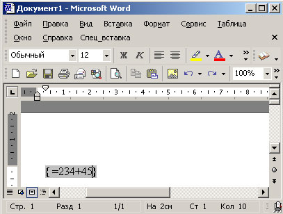 Вычислить любую сумму в Excel не составляет труда: напишите в ячейке, например, =234+45, нажмите клавишу Enter, и результат перед вами. Оказывается практически то же самое возможно и в Word. Для вычисления арифметического выражения нажмите комбинацию клавиш Ctrl+F9, напечатайте выражение (рис. 2), а затем нажмите клавишу F9 программа посчитает и выдаст результат.