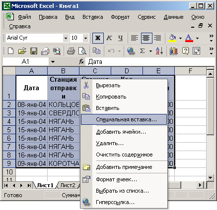Рис. 23. Выбор Специальной вставки поверх выделенной зоны ячеек