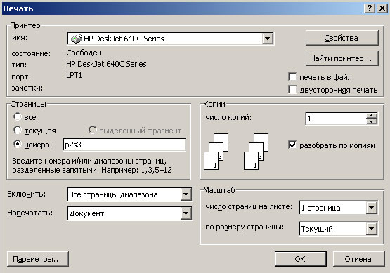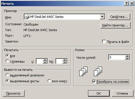 Если вам приходится печатать много документов в нескольких экземплярах, то обратите внимание на опцию Разобрать по копиям (команда Файл => Печать рис. 25).
