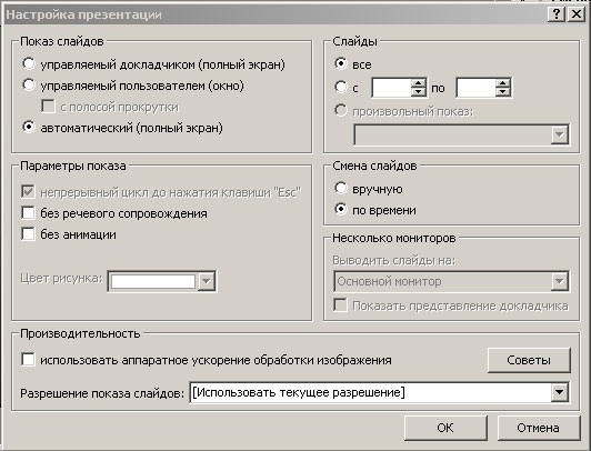 Для этого командой Показ слайдов => Настройка презентации в области Показ слайдов нужно выбрать вариант Автоматический (полный экран) (рис. 27). В этом же окне нужно определить и способ смены слайдов, выбрав вариант По времени (естественно, конкретное время для смены слайдов должно быть предварительно определено). При таком подходе пользователь будет видеть на экране только окно презентации, но не сможет переключиться на панель задач, причем ему не поможет знание комбинации клавиш Alt+Tab (конечно, если вы сами не загрузили себе игрушку, чтобы поиграть в отсутствие посетителей). Правда, и в этом случае хитроумный пользователь все же может остановить ход презентации, воспользовавшись клавишей Esc или комбинацией клавиш Ctrl+Break.