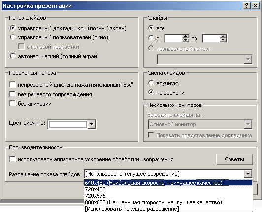 Рис. 28. Изменение разрешения экрана для показа слайдов