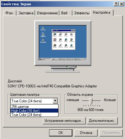 Во-вторых, для оптимального быстродействия можно попытаться установить цветовую палитру 16 бит. Для этого нажмите кнопку Пуск, выберите команду Настройка => Панель управления => Экран и откройте вкладку Настройка, а потом в области Цветовая палитра выберите из списка параметр High Color (16 бит) рис. 29.