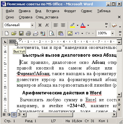 Как правило, диалоговое окно Абзац открывают из контекстного меню, щелкнув правой кнопкой на самом абзаце и выбрав команду Абзац, или из командного меню командой Формат => Абзац. Есть и более быстрый способ: поместите курсор на форматируемый абзац и дважды щелкните мышью по любому из маркеров абзаца на горизонтальной линейке (рис. 3).