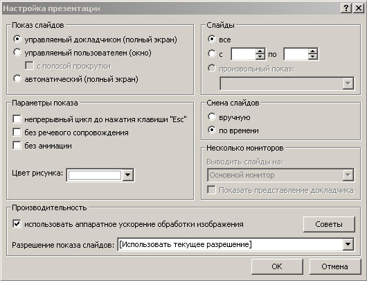 Есть и третий способ, который иногда может помочь: в меню Показ слайдов выберите пункт Настройка презентации и установите флажок Использовать аппаратное ускорение обработки изображения (рис. 30). Если на компьютере имеется такая возможность, то PowerPoint попытается ею воспользоваться. Однако данная функция может отсутствовать на компьютере, а данный способ может и привести к нежелательным последствиям в ходе демонстрации. В таком случае от него придется отказаться.