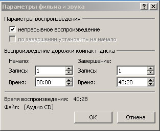 Предварительно подготовьте компакт-диск с соответствующей музыкой (или речью) и вставьте его в устройство для чтения компакт-дисков. Выделите первый слайд (или тот слайд, с которого должен быть внедрен музыкальный эффект). Выберите команду Вставка => Фильмы и звук => Запись с компакт-диска, при необходимости в поле Воспроизведение дорожки компакт-диска установите номера первой и последней записей (для воспроизведения только одной записи или части записи введите один и тот же номер в оба поля) и включите непрерывное воспроизведение (рис. 31). Для автоматического воспроизведения музыкального сопровождения при показе слайда нажмите кнопку Да.