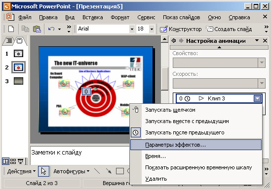 Если необходимо, чтобы музыкальное сопровождение продолжалось при показе нескольких или даже всех слайдов, выделите на слайде значок компакт-диска, щелкните по нему правой кнопкой мыши и в контекстном меню выберите команду Настройка анимации. Щелкните правой кнопкой в окне Настройка анимации на имени фонового звука (рис. 32) и выберите из всплывающего меню команду Параметры эффектов. Чтобы музыкальное сопровождение продолжалось при показе нескольких слайдов, установите переключатель в группе Закончить в позицию После, а затем задайте нужное количество слайдов (рис. 33).