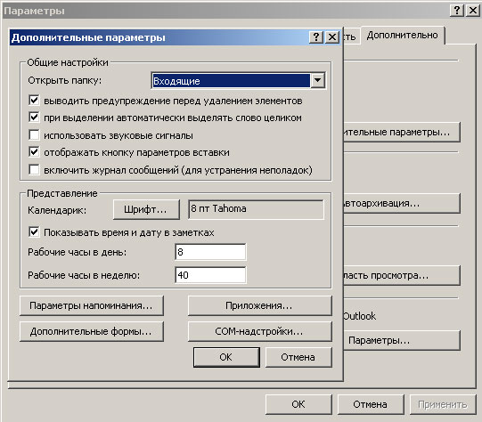 Сразу после установки Outlook по умолчанию открывается папка Outlook сегодня, что устраивает далеко не всех — большинство пользователей отдают предпочтение папке Входящие. Данную ситуацию легко изменить: выберите команду Сервис => Параметры => Дополнительно, щелкните на кнопке Дополнительные параметры и в разделе Общие настройки выберите открываемую по умолчанию папку (рис. 34).