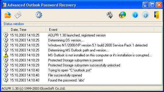 Рис. 38. Результат поиска пароля для файла outlook.pst — вычислен пароль «abc»