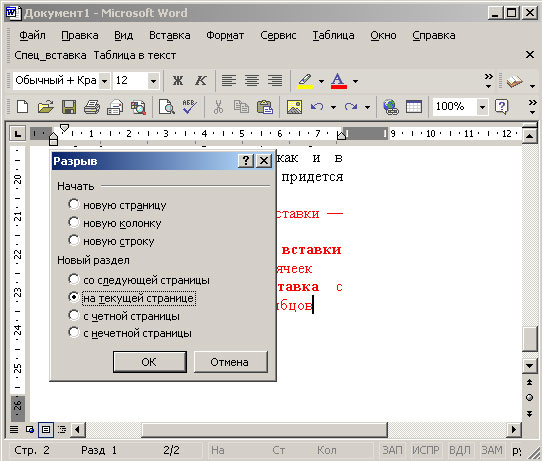 Справиться с этой проблемой достаточно просто: вставьте новый раздел документа на текущей странице, и баланс между колонками будет достигнут. Для этого установите курсор в самом конце документа и в меню Вставка => Разрыв выберите вариант Новый раздел на текущей странице (рис. 4) колонки станут одинаковыми.