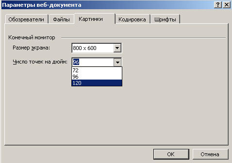 Сложнее обстоит дело, если в схеме фигурирует много мелких деталей, которые могут стать неудобочитаемыми при таком преобразовании. В этом случае можно сохранить документ со схемой в HTML-формате (команда Файл => Сохранить как Web-страницу), предварительно установив в меню Сервис => Параметры => Общие => Параметры Web-документа => Картинки максимально возможное число точек на дюйм, допустимое для вашего монитора (рис. 6). А затем изменить масштаб схемы уже в Web-документе — качество схемы будет выше.