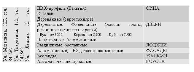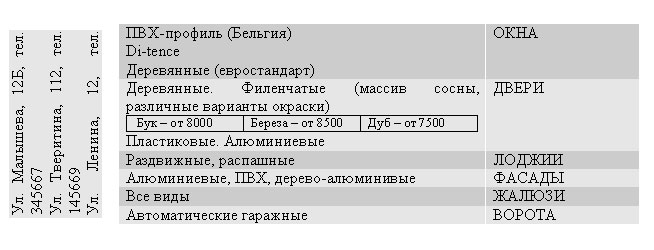 При подготовке рекламы информацию довольно часто приходится размещать в таблицах, причем в одну таблицу могут быть вложены вторая и даже третья. Поскольку в большинстве случаев границы таблиц в рекламе не должны быть видны, то они удаляются обычным способом после выделения соответствующей таблицы, нажатия правой кнопки и выбора из контекстного меню команды Границы и заливка => Границы с удалением соответствующих границ.