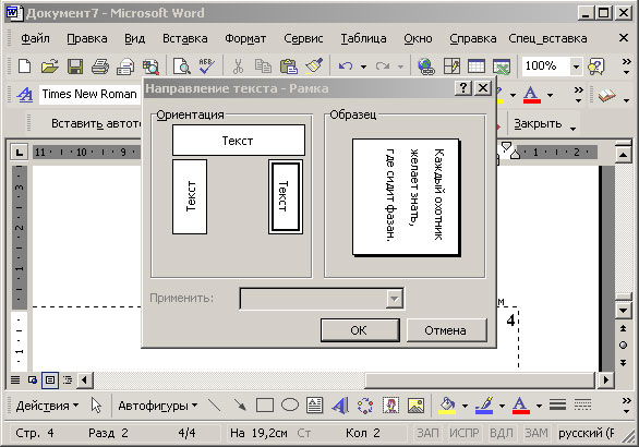 Разрешить подобную ситуацию можно несколькими способами. Так, можно создать вместо одного два документа: первый будет содержать только книжные страницы, а на месте альбомных страниц здесь будут фигурировать книжные, но пустые; второй, наоборот, будет состоять только из альбомных страниц. Нумерация в каждом документе проставляется индивидуально: в книжном номера ставятся в правом верхнем углу, а в альбомном — в правом нижнем углу с последующим изменением ориентации номера страницы командой Формат => Направление текста (рис. 9). При этом при распечатке обоих документов нужно печатать только страницы с данными, а пустые — пропускать.