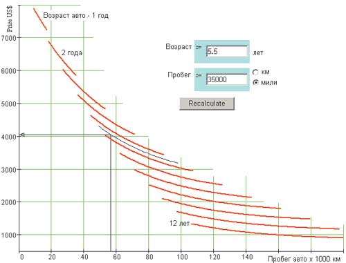 На рис. 1 показано окончание Mathcad-документа, который можно открыть в Сети (http://twt.mpei.ac.ru/mas/worksheets/Old_Car.mcd) и по которому оценивается старый автомобиль по его возрасту и пробегу. Начало документа содержит описание статистической обработки массива данных по цене подержанных автомобилей, выуженных автором из Интернета и позволивших делать соответствующие оценки. В документе есть ссылка на подробное описание методик этого статистического анализа.
