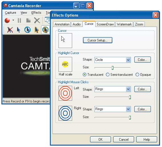 Рис. 17. В Camtasia Studio можно создавать различные эффекты выделения курсора