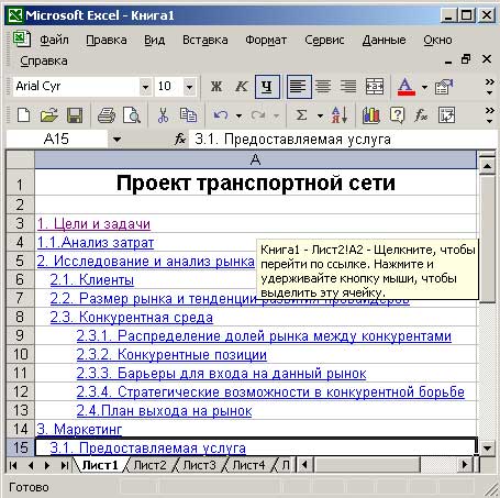 Довольно часто таблицы в Excel имеют сложную структуру, и для облегчения ориентации в них неплохо бы создать оглавление. Специальной возможности в Excel для создания оглавления не предусмотрено, но можно воспользоваться гиперссылками, которые и обеспечат переходы не только на нужные листы, но и в конкретные ячейки этих листов (рис. 18).