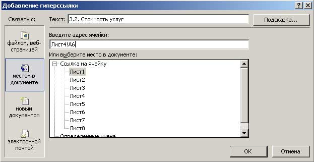 Для создания гиперссылки на конкретную ячейку нужного листа выделите соответствующую ячейку формируемого оглавления, воспользуйтесь командой Вставка=>Гиперссылка и укажите имя листа и номер ячейки для перехода (рис. 19).