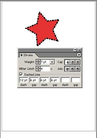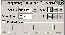 Палитра Stroke (рис. 9) определяет внешний вид обводки объекта. Здесь можно изменить ширину обводки в поле Weight (Ширина) следует учитывать, что дробные значения ширины вводятся через запятую. Включение параметра Dashed Line (Пунктирная линия) делает активными три пары полей Dash (Длина штриха) и Gap (Расстояние между штрихами), значения в которых определяют характер пунктирной линии (рис. 10).