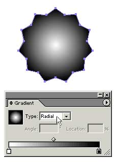 Командой Window=>Gradient (Окно=>Градиент) откройте палитру градиента. По умолчанию здесь настроен линейный черно-белый градиент, который нетрудно заменить на радиальный (рис. 22). После этого щелкните на белом квадратике в левом нижнем углу палитры Gradient (рис. 23), затем дважды щелкните на квадратике Fill в палитре инструментов и установите нужный цвет. Затем щелкните на черном квадратике в правом нижнем углу палитры Gradient и точно так же установите второй цвет. Результат будет примерно такой, как на рис. 24.