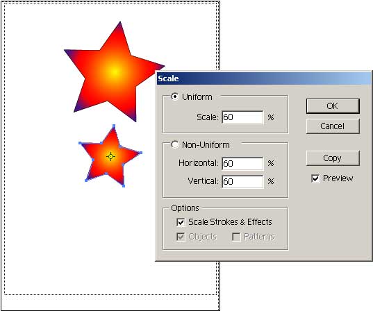 В отличие от Photoshop, инструменты масштабирования и поворотов вынесены в программе Illustrator непосредственно на панель инструментов, так что работать с ними легко и просто. Например, сделаем копию звездочки, изображенной на рис. 27, командами Edit=>Copy (Редактирование=>Копировать) и Edit=>Paste (Редактирование=>Вставить), уменьшим ее в размерах и переместим в центр большой звезды. Для уменьшения размера (учитывая, что скопированная звезда выделена) выберем на панели инструментов инструмент Scale (Масштаб), дважды щелкнув по инструменту, — откроется окно масштабирования. Включим в окне Scale флажок Preview (Предварительный просмотр), чтобы сразу видеть все изменения на рисунке, и настроим значение масштаба подходящим образом (рис. 28). Затем выделим уменьшенную копию звездочки инструментом Direct Selection и перетащим ее в центр большой звезды. Идеально расположить объекты относительно друг друга довольно сложно (хотя на практике подобные операции приходится выполнять сплошь и рядом), поэтому нужно выделить обе звездочки. Откроем палитру Windows=>Align (Окно=>Выравнивание; рис. 29) и центрировать их относительно друга, последовательно щелкнув на кнопках Horizontal Align Center (Горизонтальное выравнивание относительно центра) и Vertical Align Center (Вертикальное выравнивание относительно центра). Результат представлен на рис. 30.