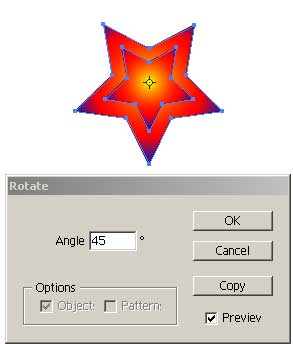 Затем, не снимая выделения с объектов, дважды щелкните на инструменте Rotate (Поворот), после чего откроется окно настройки поворота. Включите флажок Preview (Предварительный просмотр) и начните понемногу поворачивать звезды, постепенно доведя их до желаемого положения (рис. 31). Можно поворачивать объекты и по-другому, выбрав инструмент Rotate одним щелчком (никакого окна настроек в этом случае открываться не будет, но на рисунке будет обозначен центр поворота) и начав поворачивать объект мышью (рис. 32).