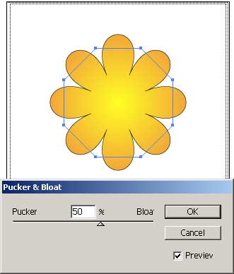 Воспользуемся созданной в предыдущем примере звездой (рис. 34). Выделим ее инструментом Direct Selection, а потом применим к ней один из многочисленных вариантов деформации командой Effect=>Distort & Transform=>Pucker & Bloat (Эффект=>Искажение и трансформация=>Сморщивать и раздувать). В зависимости от настроек деформации можно получить самые разные фигуры — начиная от солнышка (рис. 35) и кончая ромашкой (рис. 36). Обратите внимание, что флажок Preview (Предварительный просмотр) должен быть обязательно включен, иначе вы не сможете наблюдать за преобразованием изображения по мере изменения параметра.