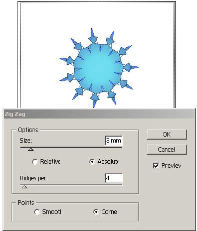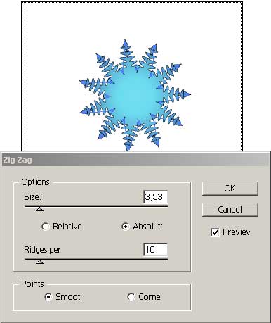 Перекрасьте исходную звездочку голубоватым градиентом, более подходящим для снежинок, и попробуйте воспользоваться фильтром ZigZag, вызываемым командой Effect=>Distort & Transform=>ZigZag (Эффект=>Искажение и трансформация=>Зигзаг). При этом может быть получено невероятное множество разнообразных снежинок (рис. 42).