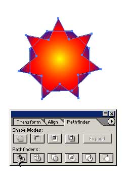 Рассмотрим один из простейших примеров разрезания объектов для формирования довольно эффектного узора. Создайте многоугольник и лежащую на нем звезду, залитые градиентом, — примерно так, как на рис. 46. Разместите их симметрично, щелкнув на кнопках Horizontal Align Center (Горизонтальное выравнивание относительно центра) и Vertical Align Center (Вертикальное выравнивание относительно центра) в палитре Align (Выравнивание), открыв последнюю командой Windows=>Align (Окно=>Выравнивание). Выделите оба объекта инструментом Direct Selection при нажатой клавише Shift. Откройте палитру Pathfinder (Следопыт) командой Window=>Pathfinder (Окно=>Следопыт) и щелкните на кнопке Divide (Разрезать; рис. 47) в итоге будут произведены разрезы в местах пересечения наложенных друг на друга фигур. Откажитесь от выделения командой Select=>Deselect (Выделение=>Ничего не выделено) и выделите только те фрагменты изображения, которые показаны на рис. 48.