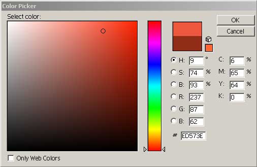 В палитре Color (рис. 4) в первую очередь стоит обратить внимание на два квадратика в левом верхнем углу палитры: сплошной (Fill) и полый (Stroke). Аналогичные квадратики фигурируют и в нижней части палитры инструментов: первый отвечает за цвет заливки, а второй — за цвет обводки объекта (рис. 5). Активным считается квадратик, стоящий впереди, и именно для него будет определен цвет в случае его выбора. Переключение между квадратами осуществляется обычным щелчком мыши. Цвет заливки или обводки объекта можно выбрать как из палитры Color, так и на панели инструментов. Осуществляется это двойным щелчком по одному из квадратиков и приводит к открытию окна Color Piсker (Подбор цвета), где можно будет выбрать нужный цвет (рис. 6).