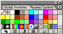 В программе Illustrator существует целая серия специализированных палитр, которые могут быть открыты или закрыты и вызываются из списка палитр, открывающегося при активизации команды Window (Окно). В числе основных палитра цветов Color, палитра каталога цветов Swatches и палитра линий Stroke.
