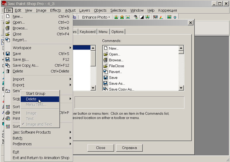 Paint Shop Pro предоставляет широкие возможности по настройке командного меню, в котором можно удалять ненужные команды и добавлять новые, перемещать команды из одного раздела меню в другой, определять варианты появления разделов меню и создавать для отдельных команд соответствующие им клавиатурные комбинации для быстрого запуска. Кроме того, несложно дополнить командное меню собственными разделами и подразделами.