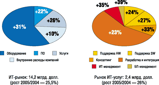 Рис. 1. Размеры, структура и динамика сегментов ИТ-рынка в 2005 году (источник — Linex, 2006)