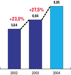 По данным Market Visio, объем экспорта в 2003 году составил 348 млн. долл., в 2004-м — 560 млн. долл., а в 2005-м — 740 млн. долл. Ожидается, что к концу текущего года объем экспорта превысит 1 млрд. долл. (рис. 13).