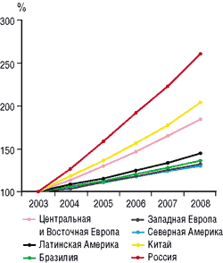 Рис. 4. Рост ИТ-рынка в различных регионах (источник — IDC, 2005)