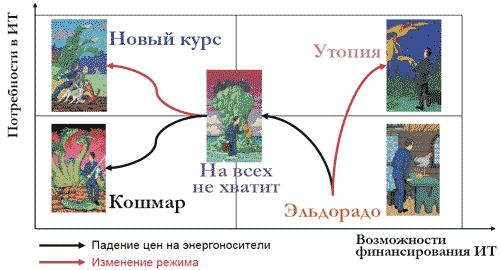 В зависимости от динамики мегафакторов разработаны пять возможных сценариев развития российского ИТ-рынка: «Эльдорадо», «На всех не хватит», «Кошмар», «Новый курс» и «Утопия» (рис. 5).