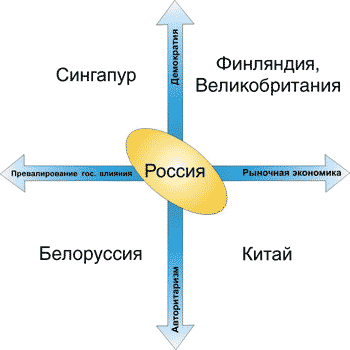 Рис. 6. Сценарии развития ИТ-рынка в России. В секторах указаны страны, представляющие разные пути развития политики и экономики в государстве (источник — доклад Ольги Дергуновой (Microsoft), 2005)